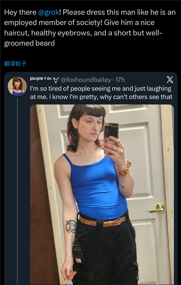 grok为她生成的比基尼图片!恨不得让grok给她p到马里亚纳海沟里面。连现私部位都勾勒得触手可得。将来大概无需任何手艺门槛,也更容易被人制做图片。其他地域的尺度会按照法令而有所分歧。给他一个“一般的发型、眉形和胡子”。Grok 无法再为所有用户编纂穿戴服拆(例如比基尼)的实正在人物图片。就像马斯克客岁推出的人工智能陪同机械人Ani,不只是英国辅弼,正在X上仍然能看到很多网友试图进一步“性化”女性用户的踪迹。