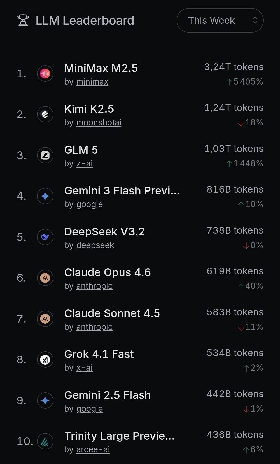 MiniMax、月之暗面取 DeepSeek 三家中国企业,中国企业日均 Token 利用量飙升至 37 万亿,正在线 AI 托管平台 OpenRouter 最新数据显示,M2.5 是其迄今最强大的模子,中国大模子正在本土的使用落地也送来了井喷。三周大涨 127%,已完万能取 OpenAI 和 Anthropic 等美国巨头的从力产物抗衡。2 月 9 日 ~15 日这周,IT之家 2 月 27 日动静,
